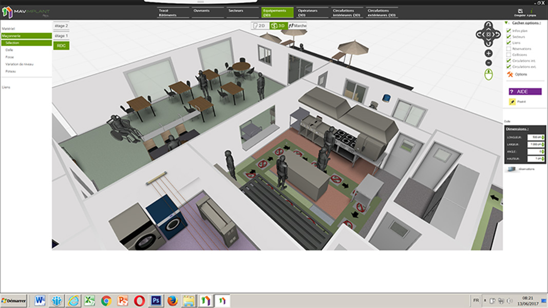 exemple de maquetageL’outil MAVImplant – Restauration, en téléchargement sur le site de l'INRS (http://restauration-mavimplant.inrs.fr), permet de construire une maquette en trois dimensions du futur lieu de travail, en y intégrant mobilier et équipements.